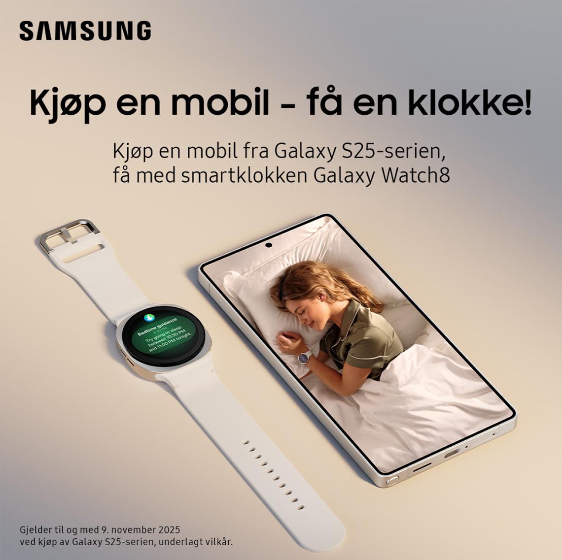 Tilbudet gjelder kun telefoner som er kjøpt og aktivert i Norge. Tilbudet gjelder fra 13.10.2025 til 09.11.2025. Tilbudet kan ikke kombineres med andre tilbud. Det er kun mulig å benytte seg av tilbudet en (1) gang per kvittering/ faktura og person/husstand som oppfyller kampanjevilkårene. For å få ditt tilleggsprodukt fra Samsung må fullstendig navn, e-postadresse, kvittering og IMEI nummer for kjøpet av utvalgt Galaxy-modell registreres via Samsung Members eller på https://campaign.modino.no/S25-Watch8/ innen 30.11.2025.